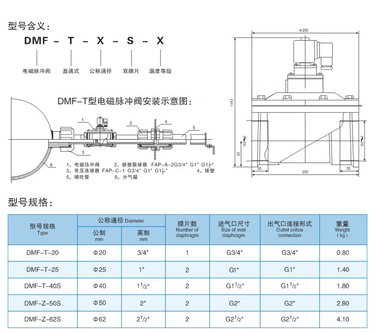 DMF-T型電磁脈沖閥為直通閥,其進(jìn)氣口之間夾角為180°,(進(jìn)出口中心線為同一直線),其進(jìn)口與儲(chǔ)氣筒連接,出口與噴吹管連接。氣流暢通,能提供符合要求的清灰氣脈沖。
